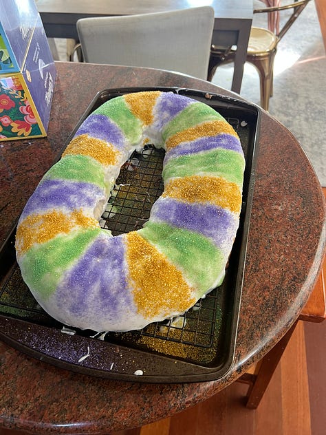 We had two king cakes, one made by my wife, and one made by the woman who got the baby last year